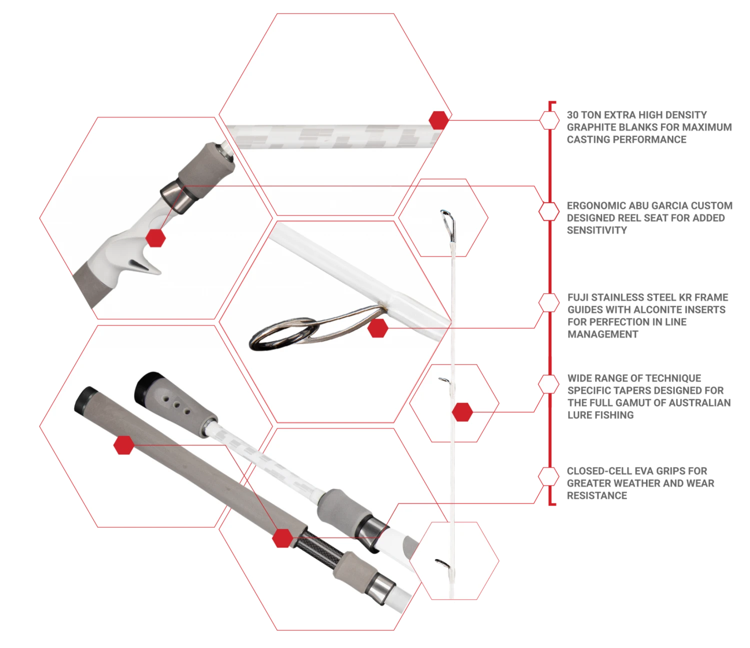 Introducing the next generation of Veritas rods. The introduction of Powerlux 100 increases the rod’s strength by 15 percent while also reducing the rod’s overall weight by 5 percent. The new Veritas rod family gives anglers the performance, sensitivity, and durability they need to win, whether they’re fishing for fun or for a paycheck. The Powerlux 100 resin system evenly distributes nano particles between each carbon fiber to enhance the rod’s performance and strength by preventing cracks in the blank material. The Powerlux technology helps produce rods with higher break strengths and improved impact and fracture resistance. The Abu Garcia custom designed reel seat delivers hypersensitivity around the exposed blank sections and improves comfort for all-day fishing. Coupled with titanium alloy guides with zirconium inserts and closed cell EVA split grips, the Abu Garcia Veritas pushes the limits of high-performance fishing rods.