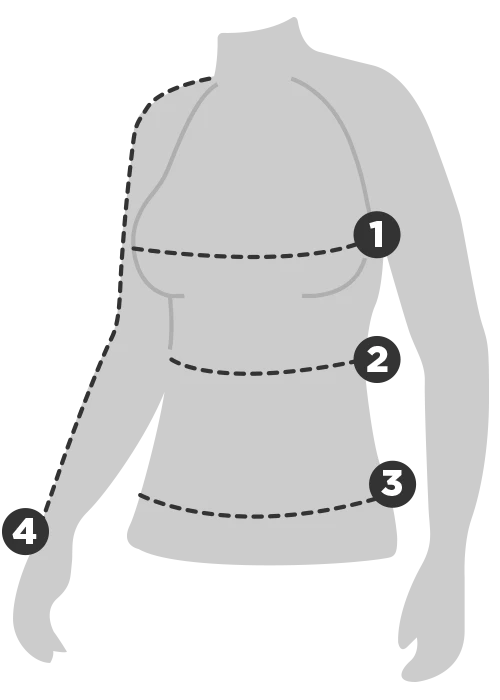 – Chest/Bust – Measure at the fullest part of the chest, under the armpits and over the shoulder blades, keeping the tape measure firm.