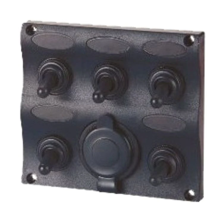 Waterline moulded black panel with fuses and labels. The 3 and 5 gang switch panels incorporate a power take off socket or a USB charging port. Switches can be stacked above or below each other or side by side to create a large bank of switches. The switch panels are weatherproof, have reinforced corners to prevent cracking from screw holes and gaskets for a water tight seal.