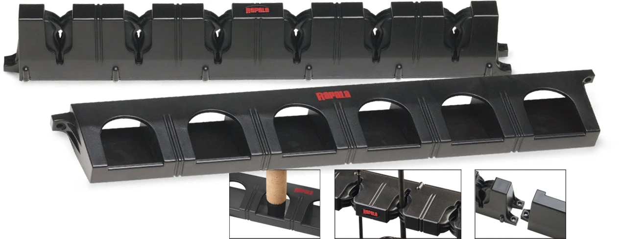 An essential piece of fishing equipment that is often overlooked is the storage rod holder. They are great for keeping all your fishing rods and reels secured so they canât be damaged. By holding your rods and reels in place securely, the Rapala 6 Rod Deluxe Rod Holder will ensure your lines donât become tangled so you donât waste precious fishing time untangling a mess of line. Perfect for in your boat, car or garage, it can store up to 6 rods, so it can hold all of your rods in one place. The Rapala 6 Rod Deluxe Rod Holder can be mounted horizontally along a wall, or even overhead. The last thing you want to do is damage your fishing gear, or find your lines in a tangled mess. The Rapala 6 Rod Deluxe Rod Holder will make sure that this doesnât happen.