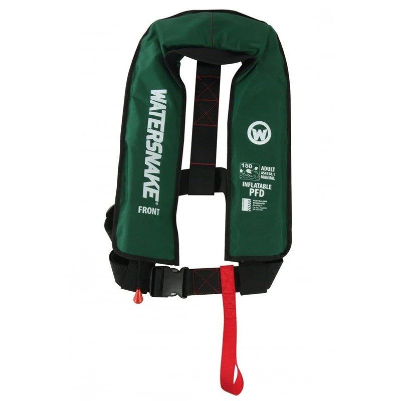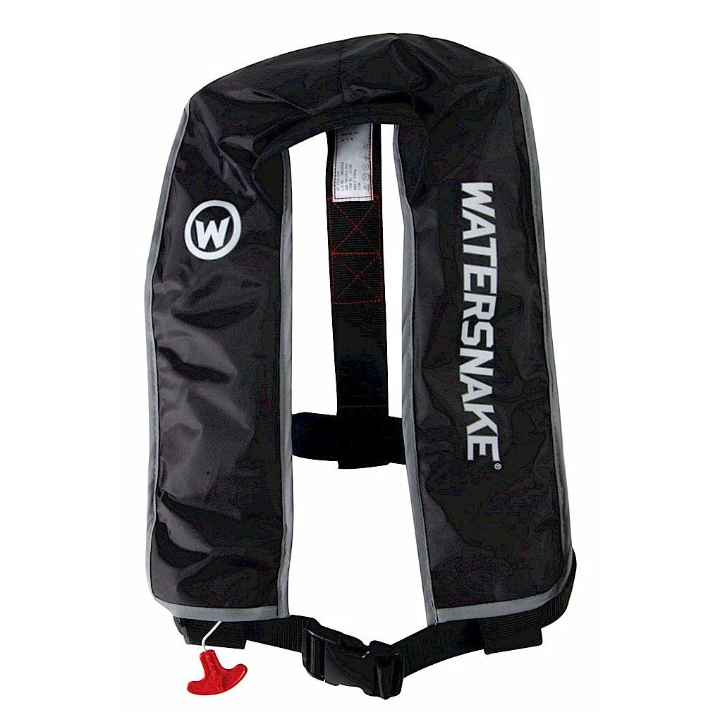 This Watersnake Inflatable PFD is designed flat for easy storage and has a manual inflation system that is easily activated by pulling down on the toggle to initiate the release of the 33g CO2 gas cylinder. There is also a mouthpiece for oral inflation.